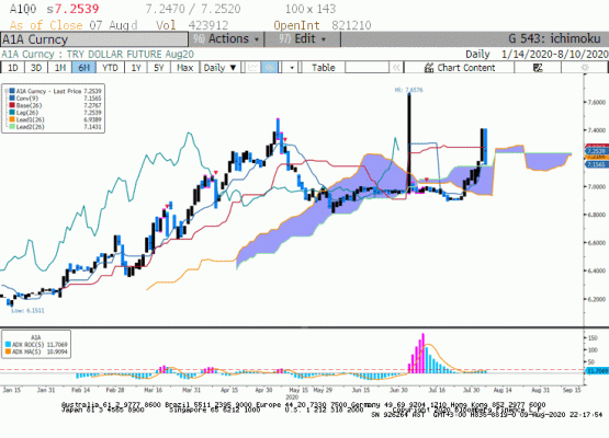 Ağustos Vadeli Dolar TL geçtiğimiz günü 7,3447 seviyesinden kapattı. Döviz piyasasındaki son dönem fiyat gelişmeleri Dolar-TL'de 1 aylık zımni volatilite seviyesini Mart 2019'dan bu yana en yüksek seviye olan %27'ye taşıdı. Hafta sonu ABD Başkanı Donald Trump, koronavirüs pandemisinin ekonomiyi sarsmaya devam etmesi ile birlikte, bordro vergilerinde geçici erteleme, işsizlik yardımlarının uzatılması, öğrenci kredisi borçları ve gecikme faizlerinde erteleme ve ev sahiplerinin kiracıları evden çıkarmasına yönelik yasağın uzatılmasını öngören dört kararnameyi imzaladı.