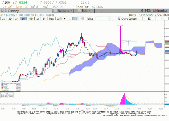 Teknik olarak, Ağustos vadeli Dolar/TL kontratında geri çekilmelerde 6,9850 desteği altında 6,9720 seviyesi ön plana çıkarken yükselişlerde 7,0540 ve 7,0750 direnç olarak görülüyor.