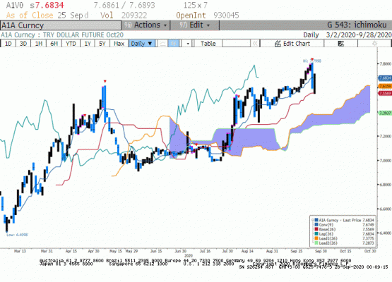 Ekim Vadeli Dolar TL geçtiğimiz günü 7,7694 seviyesinden kapattı. Hafta başında Hazine Bakanı Berat Albayrak YEP ile ilgili beklentileri açıklandı. Belirlenen yeni tahminlere baktığımızda 2020 yılında %0,3, 2021 yılında ise %5,8 büyüme beklentisini olduğunu görüyoruz. Tahmin edilen fiyatlara baktığımızda önümüzdeki günlerde gerek vergi politikaları ile ilgili gerekse para politikaları ile ilgili yeni adımlar görebiliriz. Geçtiğimiz haftadan bu yana TCMB’nin yanında BDDK’da normalleşme yolunda adımlar atıyor. Geçtiğimiz gün de yine yeni bir adım geldi ve Vadelerine göre TL mevduata ödenecek vergiler indirilirken, kambiyo işlemlerinde uygulanan BSMV yüzde 1'den binde 2'ye indirildi.