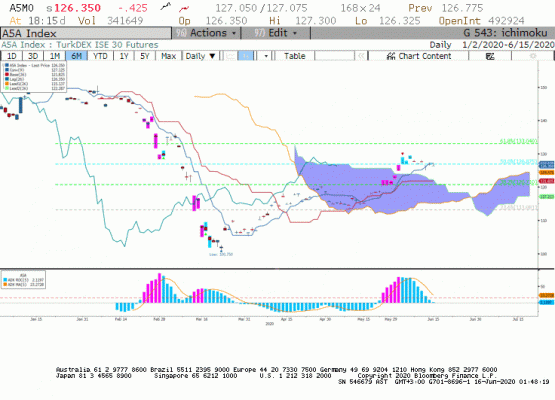 Haziran Vade BIST 30 kontratında, kontratın günü 126,350 seviyesinden satıcılı kapattığını gördük. Geçtiğimiz hafta piyasa fiyatlamalarında FED'den gelen açıklamalar ön plana çıkmış olup küresel piyasalar satış baskısı altında kalmıştı. Yurtiçi piyasalar pozitif ayrışmaya devam ediyor olsa da gerek endeks gerek kontrat günü kısmi satışlar ile kapattı