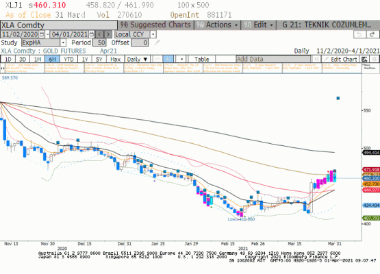 Nisan vadeli altın kapanışı 460.310 olarak gerçekleşti. Ons altın 31 Mart seansında ABD tahvil faiz oranlarında naif gerilemeden aldığı cesaret ile 1675 sınırından desetk buldu ve 1700. üzerine çıkmayı başardı. Günlük grafikte daralan bollinger bant altın piyasasında volatlite artışının yakın olduğu izlenimi veriyor. Ancak yükselişin orta vadeye yayılabilmesi için 60 haftalık üssel hareketli ortalama 1760 dolar üzerinde kapanış arıyoruz. Fiyatların 1860 dolar üzerine yerleşmesi altının kendi iç dinamiklerinde olan enflasyon bekleyişinin fiytalanması anlamı taşıyor olacak. Şimdilik tepki olarak görülen yükseliş ileriye yönelik pozisyonlanma için takibe alınabilir.Dolar/TL paritesin eglince dün yaşanan geri çekilme dışarıda DXY içeride haber akışına bağlı olarak birkaç güne yayılabilir. Bu senaryoda gram altın yatırımcısı için bugün ve yarın ons cinsi fiyatlama daha önemli olacaktır.