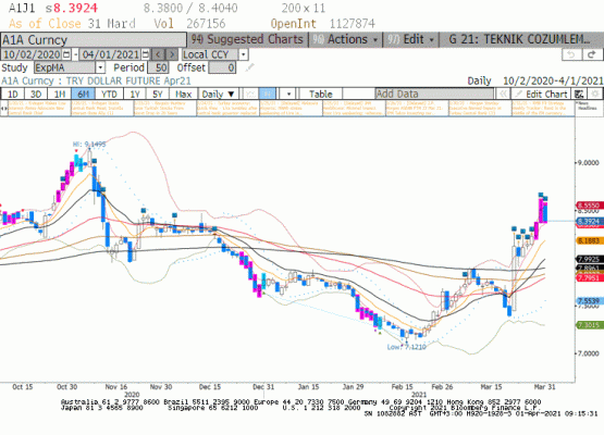Nisan vadeli Dolar/TL paritesinde 8.3924 seviyesinde kapanış ile TL'in değer kazanımı dışarıda DXY hareketine bağlı olarak devam edebilir. 31 Mart Çarşamba ABD Başkanı Biden 2.25 trilyon dolarlık alt yapı yatırımları içeren bunu yanınd alt başlıklarda detaylı istihdam piyasasına destek veren bir paket açıkladı. Nisan ayından sosyal reformları kapsayan yeni bir paket açıklanması ve federal harcamaların büyüklüğünün Demokratlar dönmeinde 5 trilyon dolara kadar çıkabileceği konuşuluyor. Paketin finansmanı için Demokratlar vergi artışına gidiyor kurumlar vergisi %21'den %28'e çıkarıldı ayrıca Nisan ayında açıklanacak paketin finansmanı içinde gelir artırıcı aynı zamanda değişik gelir grupları arasında açılan gelir farkını azaltmaya yönelik olması bekleniyor. Paket öncesinde açıklanan teşvik paketinin aksine kongreden onay almakta zorlanabilir. Özellikle vergi artırımları konusunda Cumhuriyetçi kanadın onay vermek istemeyeceği ve Demokratlar içerisinde de bazı senatörlerin pakete kuşkulu yaklaştığı biliniyor. Yeni bir harcama paketi açıklanırken ülkenin para birimi nasıl bir yön bulacak. Paket açıklanmadan önce ABD 10 yıllık tahvil faiz oranları ve DXY geriledi. Ancak federal harcamalar ve %6 üzerinde ekonomik büyüme ile 2021 senesinde ABD ekonomisinin enflasyon yaratması muhtemel. görülüyor. Bu nedenle 10 yıllıklarda piyasa %2 rakamını kanıksamış iken oranlarda yükseliş devam edebilir. Dolar Endeksi'ne gelince Avrupa başta olmak üzere sepet para birimlerinin ABD ekonomisi pandemiden çıkarken geride kalması ile arada yaşanan geri çekilmelere rağmen gücünü koruyabilir. Bu senaryoda Dolar/TL paritesindeki geri çekilmenin kısa vadeli bir düzeltme haraketi olduğunu düşünüyoruz. Hızlı yükselişin ardından Nisan vade Dolar/TL paritesi 8.3500 altında fiyatlama ile 8.2000 TL seviyesine doğru geri çekilebilir. Bu noktada 31 Mart son tarih olan mevduat stopaj indirimlerinin Mayıs sonuna kadar uzatılmış olması da etkili olacaktır. Ancak 8.2000 TL altına yerleşmeden bu harekete kısa vadeli düzeltme olarak bakıyoruz.