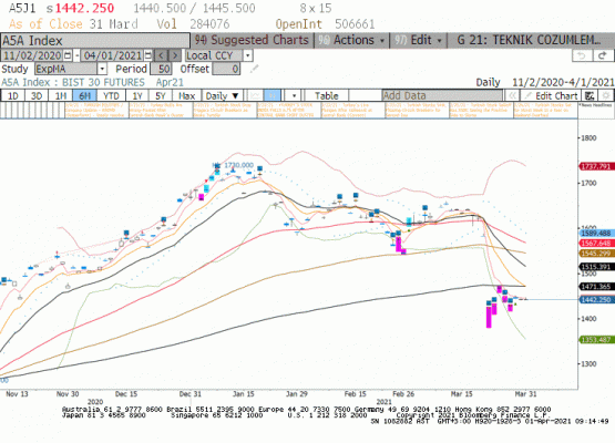 Niasn vade BIST30 endeksi 01 Nisan tarihine kadar dar bir aralık içerisinde kalarak 1470 üzerine yerleşmekte zorlandı. Dışarıda ABD alt yapı yatırımlarının içeren yeni harcamalar ile küresel hisse senedi endeksleri dün pozitifdi. Gelişen ülke piyasaları tarafında da ülke bazında performans farkları olmasına rağmen pozitif bir eğilim içerisindeydi. Haftanın ilk 3 işlem gününde BIST100 küresel piyasalarda yaşanan yükselişe katılmakta zorlandı. Sektöre özel beklentiler ile bazı hisse senetlerinde hareketlilik gerçekleşti ancak özellikle bankacılık sektöründe devam eden satış baskısı ile endeks yukarı gitmekte zorlanıyor. Bugün küresel piyasalardaki pozitif harekete bağlı olarak içerideki açılışın pozitif olması beklenir. Öte yanda yükseliş denemelerinin orta vadeye yayılabilmesi için endeksin 100 günlük üssel hareketli ortalaması olan 1470 endeks seviyesi üzerine yerleşmesi gerekiyor.