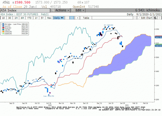 Yakın Vade BIST 30 kontratı geçtiğimiz günü 1588,25 seviyesinden kapattı. Son günlerde ön plana çıkan GameStop hisselerindeki aşırı oynaklık ve sonrasında yaşanan gelişmeler, Çin kaynaklı likidite sorunu ve ABD'nin teşvik paketine ilişkin belirsizlikler dünya borsalarında satışların derinleşmesine sebep olurken, yaşanan satışların da etkisi ile kontratta 1620 seviyesindeki ana desteğin kırıldığını ve yükseliş trendinden çıktığımızı gözlemlemiştik. Hafta başı itibari ile küresel piyasalarda yaşanan toparlanma, yurt içinde de alımların momentum kazanmasını sağladı.