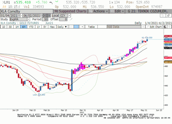02 Haziran seansında Dolar/TL paritesinde yükseliş ve ons altının 1900 üzerinde kapanış ile statükoyu koruduğu ortamda Haziran vade gram altın fiyatları 5.760 puan yükselerek 535.410 seviyesinde günü kapattı. TL’nin zayıf seyri gram altın fiyatlarını günlük grafikte bollinger üst bant 542 TL/grama taşıyabilir.