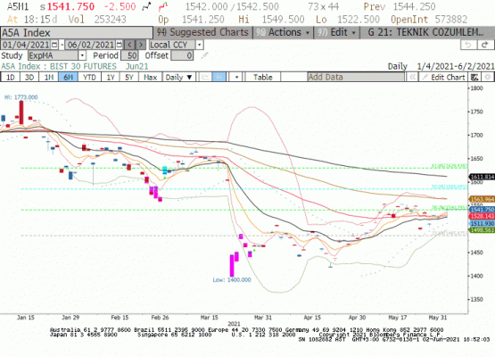 Haziran vadeli BIST30 endeksinde günün düşük seviyesi 1522 iken sonrasında gelen alımlar ile endeks 02 Haziran seansını 1541.75 seviyesinde kapattı. Haziran vade BIST30 endeksi bu hafta 1540 üzerinde kapanışlar ile güç toplayabilir ise 1564 seviyesine doğru yükselişini sürdürebilir. Bugün açıklanacak Mayıs ayı enflasyon rakamları ve TL’nin gelişmiş ülke para birimleri karşısında değeri vadeli endeksin performansını etkileyecektir. Ayrıca bugün açıklanacak haftalık TCMB istatistiklerinde bono ve hisse senedi piyasalarına yabancı portföy giriş çıkış rakamlarını öğreniyor olacağız. 21 Mayıs haftasında hisse senedi piyasasına 51 milyon dolar bono piyasasına 175 milyon dolar giriş olmuştu. Haziran vadeli BIST30 endeksi haftanın geri kalanında 1540 üzerinde kapanışlar ile güç toplayabilir ise 1564 civarında olan 100 günlük üssel hareketli ortalamasını test edebilir.