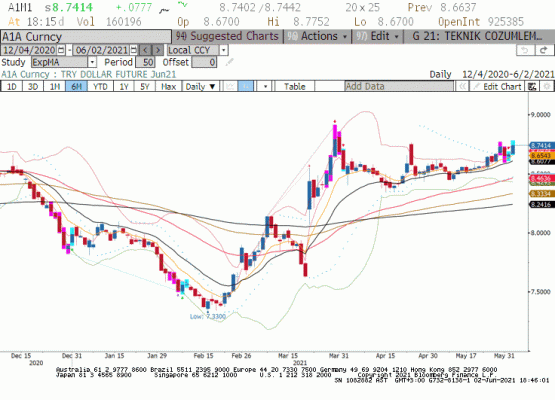 Haziran vadeli Dolar/TL paritesinde günün yüksek seviyesi 8.7750 iken kapanış 8.7414 olarak gerçekleşti. Türkiye 10 yıllık tahvil faiz oranı %18.83 seviyesine yükselirken 5 yıllık CDS primi 405 civarında fiyatlandı. Opsiyon piyasasında Dolar/TL paritesinde aylık öngörülen volatilite günlük bazda %8 yükseliş ile 17.50’ye yükseldi. Spot kurun Asya seansında 8.8000 TL gördüğü öngörülen volatilitenin arttığı ve dolar lehine opsiyon alımları olan gün içinde Türkiye Cumhuriyet Merkez Bankası’nın yatırımcılara yaptığı resmi sunumda öne çıkanlar; erken faiz indirim endişelerinin yersiz olduğu, bankanın politika faizini enflasyon üzerinde koruyacağı ve enflasyonda belirgin iyileşmenin yılın 3. Çeyreğinde görülebileceği yönündeydi. Gelen açıklamalar TL ve cinsi varlıklarda bir miktar rahatlama getirmiş olsa da 17 Haziran toplantısına bu konuya ilişkin yapılan açıklamalara piyasanın hassasiyeti yüksek olacaktır. Haziran vadeli Dolar/TL paritesi 8.6500 altına yerleşmedikçe kısa vadede yükseliş eğilimi devam edebilir.