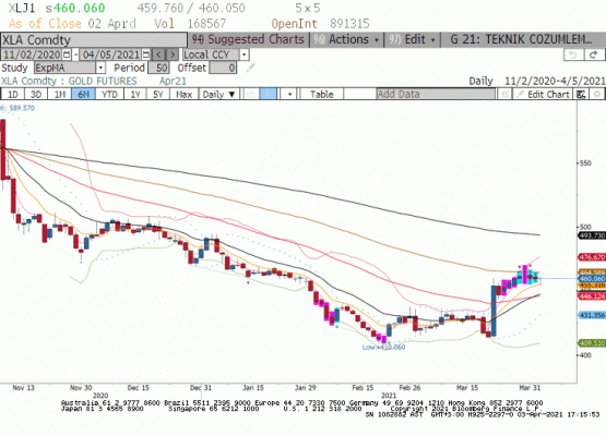 Ons altın Mart ayının son iki işlem gününde görülen 1678 seviyesi ardından haftayı 1728 seviyesinde kapattı. Paskalya tatili nedeni ile işlem hacminin piyasaların kapalı olduğu son işlem gününde güçlü ABD istihdam verisine verilen tepki de sınırlıydı. Tepki bugüne kaldı ise ons altın yükseliş için zorlanabilir. Öte yanda altın piyasası ve tahvil getirileri arasında son dönemde gözlenen ters korelasyon bu hafta tahvil getirilerinde yaşanan kısa vadeli geri çekilme hareketi ile piyasaya şans veriyor. Ons altın 1725 dolar üzerinde kaldığı sürece 1760 dolara doğru yükseliş eğilimini koruyabilir. Gram altın fiyatlamasında Dolar/TL paritesi spot piyasada 8.0000 TL altına yerleşmediği sürece alış TL'in değerlemesi gram altın fiyatına destek olacaktır. Gram altında fiyatların 465 TL/gram üzerine yerleşmesi durumunda bollinger üst banda doğru yükseliş potansiyeli görüyoruz.