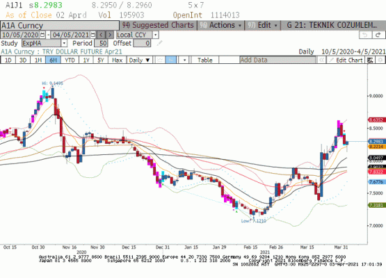 Nisan vadeli Dolar/TL paritesi son 3 seansta TL'in değer kazanımı ile haftayı 8.2983 seviyesinde kapattı. 22-31 Mart tarihleri arasında piyasanın öngördüğü volatilite yükselirken piyasanın bu durumu taşımakta zorlandığını ve düzeltmeye geçtiğini gördük. Son beş işlem gününde spot piyada TL Dolar karşısında %0,73 değer kaydederek haftayı 8.1672 seviyesinde kapattı. Haftanın ilk işlem gününde Mart ayı enflasyon rakamını öğrenmiş olacağız. Bloomberg anketine katılan ekonomistlerin ortak beklentisi Tüfe'in aylık %1,10 artış ile %16,20'ye yükseleceği yönünde YI-üfe deki artışın ise %2,30 olacağı tahmin ediliyor. Mart ayında da devam eden enflasyonist eğilim bugün TL'in değer kazanımını limitleyebilr.