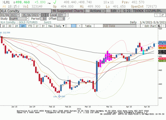 Haziran vade gram altın günlük grafikte ons altın fiyatlarından aldığı destek ile bollinger üst banda yöneldi. Kuşkusuz vadeli altında 500 TL üzerinde fiyatlama yatırımcı için farklı bir evre fiyatlama olarak değerlendirilecek.