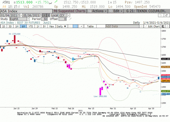 Dışarıda gösterge olarak takip ettiğimiz S&P500 endeksi dünkü seansta gün içinde 4150 endeks seviyesi altına geçmiş olsa da sonrasında toparlandı. İçeriye gelince geçtiğimiz haftanın istatistiklerinde hisse senedi piyasasına 32 milyon dolar bono piyasasına 33 milyon dolarlık yabancı giriş olduğunu öğrendik. Rakamlar küçük olmakla birlikte alış tarafındaki eğilim piyasa için moral kaynağı olarak görülebilir. Dünkü seansta BIST30 içinde bankacılık sektörünün desteği devreye girince Haziran vadeli BIST30 endeksi 15.75 puanlık yükseliş ile 1513 seviyesinde kapanış yaptı. Bugün de sektör içindeki hisse senetlerinin göreceli iyi performansı sürer ise vadeli BIST30 endeksi 50 günlük üssel hareketli ortalaması olan 1522 seviyesini teste edebilir.