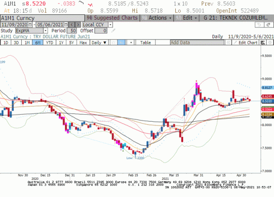 Haziran vadeli Dolar/TL paritesi gün içinde en yüksek 8.4381 seviyesini gördükten sonra 8.4000 sınırında kapanış yaptı. PPK toplantısında piyasanın beklentisi doğrultusunda politika faizinin %19 seviyesinde bırakıldığını gördük. Piyasanın endişesi erken bir faiz indirimi ile enflasyonun önüne geçilemeyeceği yönündeydi. Bu çerçevede TCMB’nin enflasyonda aşağı yönlü ivme görmeden sıkı para politikasından ödün vermeyeceğini toplantı metninde ifade etmiş olması her ne kadar kısa vadede fiyatlamalarda fazla etkili olmasa da pozitif diyebiliriz. Dışarıda Dolar Endeksi’nin 91.50 üzerine geçemeyerek geri çekilmesi de gelişen ülke para birimlerini destekliyor. ABD tarafında devam eden pozitif veri setini bir kenara bırakarak Dolar Endeksinde geri çekilmenin sürmesi içeride TL’nin değer kazanıma destek olur. Ancak daha ziyade içeriye odaklı ve enflasyon ve faiz politikası ile şekillenen ve oynaklıkta düşüşe rağmen geri çekilmekte zorlanan vadeli Dolar/TL profili ağırlıkta görülüyor.