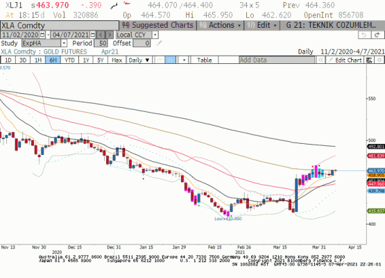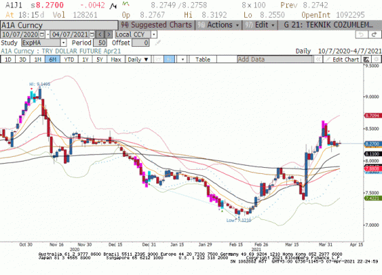 Nisan vadeli Dolar/TL paritesi dar aralıkta hareket ardında 8,2700 seviyesinde kapanış yaptı. Dün açıklanan Mart ayı FED toplantı tutanaklarına göre banka enflasyonun endişe kaynağı olması için zaman gerektiğini düşünüyor. Yine geçtiğimiz toplantılara benzer varlık alımlarını azaltmak için erken. Banka bu görüşü yanında teşvik paketi ve aşılama sürecinin ekonomi pozitif etkisine dair iyimser olduğunu söylüyor. Dışarıda ABD ekonomisine ilişkin olumlu beklentiler sürerken Dolar Endeksi 92,137 düşük seviyesi ardından günü 92,500 sınırında kapattı. Dün açıklanan ekonmik verilerde Mart ayı nakit bütçe dengesi 41,0 mia dolar olarak pozitif. Bugün her Perşembe olduğu haftalık yabancı portföy istatistikleri açıklanacak. TL ve cinsi varlıklardaki sakin seyre bakarak bu haftaki verilerde yabancı portföy çıkışlarının ivme kaybettiğini görebiliriz. 15 Mayıs PPK toplantısına kadar Nisan vade Dolar/TL paritesinde 8,1000 TL altında fiyatlama olsa da kalıcı olmayacağını döviz piyasasının PPK toplantısını beklediğini söyleyebiliriz.