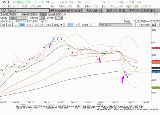 07 Nisan seansında 1461,50 endeks seviyesine kadar gerileyen vadeli endeskte kapanışın 1463 seviyesinde olduğunu gördük. İki hafta önce yaşanan sert satış dalgası ardından içeride hisse senedi piyasasına ilginin azaldığını görüyoruz. Halka arzlar ve halka arz haberleri olan hisse senetleri dışında piyasayı direnç seviyelerine sürükleme potansiyelinde olanlar da dışarıdan satış alıyor. Bu tabloda kısa vadede en iyi senaryoda 1495 seviyesine yükseliş olabileceğini düşünüyoruz. Aşağıda 1440 altında kapanışlar piyasanın tekrar satıcıların kontrolüne geçtiği anlamına geliyor.