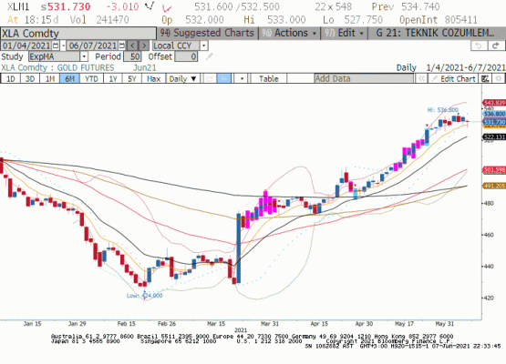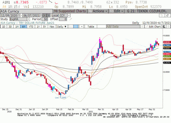 Haziran vadeli Dolar/TL paritesinde günün yüksek seviyesi 8.7958 iken kapanış 8.7365 seviyesinde gerçekleşti. Haftaya başlarken Dolar/TL paritesinde geri çekilme yaklaşan NATO toplantısı ve ABD Başkanı Biden ile Sn. Cumhurbaşkanı Erdoğan arasında yapılacak görüşmeye ilişkin olumlu beklentiler bağlanabilir. Piyasalar bu gelişmeden gelebilecek ılımlı mesajları şimdiden satın almak istiyor. Öte yanda hafta sonu Yellen’ın açıklamaları ardından enflasyon tehdit mi Amerikan ekonomisi yüksek faiz ortamına hazır mı soruları arka planda yerini koruyor. Bu hafta ABD tarafında açıklanacak olan Mayıs ayı Tüfe rakamının aylık %0.4 artış ile yıllık rakamı %4.7 seviyesine taşıması beklenirken beklentilerin üzerinde gerçekleşme gelişen ülke para birimlerinde negatif etki yaratabilir. Öte yanda, geçtiğimiz haftanın son üç işlem gününde yükselen Haziran vadeli Dolar/TL paritesi aşırı alım bölgesinde ve 8.6500 seviyesine doğru geri çekilebilir.
