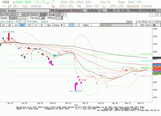 Haziran vadeli BIST30 endeksi ağırlığı yüksek olan bankacılık sektörü hisse senetlerinden aldığı destek ile 07 Haziran senasını yükselerek 1563.500 seviyesinde kapattı. Hafta sonu ABD Hazine Bakanı Yellen açıklamaları gelişen ülke hisse senedi piyasaları için negatif olabilir endişesi vardı. Ancak yeni haftaya başlarken vadeli endeksin daha ziyade kendi dinamikleri ile fiyatlama yaptığını ve TL’nin değer kazanımından aldığı destek ile günün yüksek seviyelerine yakın kapanış yaptığını gördük. Haziran vadeli BIST30 endeksi 1550 üzerinde kapanışlar ile güç toplayabilir ise 1585 direncini test etmek isteyebilir.