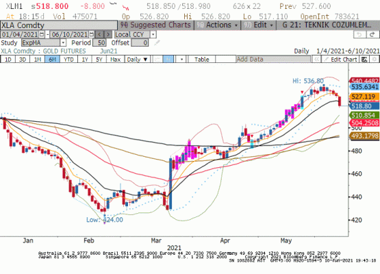 Perşembe günün %1.67 düşüşle 518 TL seviyelerinde kapatan Haziran Vadeli Gram Altın 21 günlük üssel hareketli ortalamanın altında kapatarak marttan bu yana bunu ilk kez başarmış görünüyor. 515 seviylerinde tepki alımları gerçekleşmiş olsa da Biden’ın Türkiye ziyaretinden çıkacak olumlu yorumlar ile birlikte dolar/TL üzerinde oluşacak baskıyla 500 seviyelerini test edebilir. Açıklanan ABD enflasyon verisinin beklentilerin aksine yukarda gerçekleşmesi doların dünya çapında değer kaybetmesine yol açtı ve Haziran kontratı için bir short fırsatı dogmuş olabilir . Fakat bununla birlikte Biden tarafından gelecek olumsuz yorumlar TL’yi baskılamaya devam edecektir. Unutulmamalıdır ki Ons Altın tarafında beklentiler yukarı yönde ve dolara baglı olan düşüşler altındaki yükselişlerle birlikte sınırılı kalabilir.