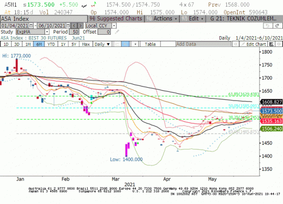 Haziran Vade BIST30 günü %0.73 ile 1576 seviylerinden kapadı. Dünya piyasalarının karışık seyrettiği Perşembe günü BIST pozitif ayrışarak günü yükselişle kapadı. Endeksteki yabancı ağırlığının hala tarihi düşük seviyelerde olmasından dolayı yükselişler sınırlı kalıyor. Bunula birlikte Nisan ayından itibaren yeni bir yükseliş trendi oluşturmaya çalışan BIST30 içindeki ağırlığı bir hayli fazla olan Bankacılık endeksi için kritik seviyeler olan 1270 seviyesinin geçilmesi BIST30 endeksindeki yükselişi hızlandırabilir. Kritik seviyeler olan 1570 üzeri kapanışı Perşembe günü gerçekleştiren Haziran kontratı bu seviyelerinin teyitinin alınmasıyla birlikte yönünü tekrar 1600 seviyelerine çevirebilir.