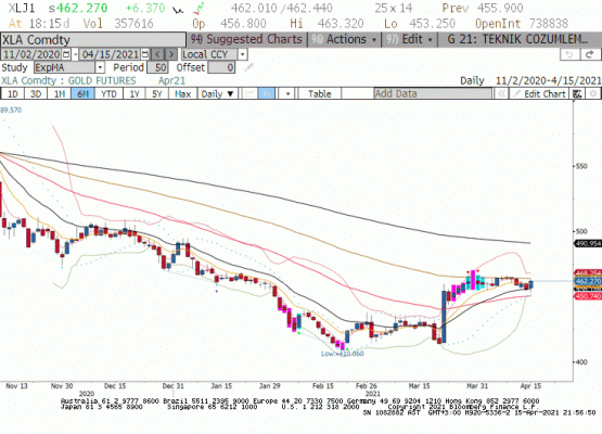 Bir gün 10 dolar artı bir gün 10 dolar eksi Dolar Endeksi 91.70 altında iken altın neyi bekliyor sorumuzun cevabı dün geldi. Altın yatırımcısı piyasaya dönüş için tahvil getirilerinde düşüş bekliyor. Nitekim dün 10 yıllık tahvil faiz getirilerinde en düşük 1.5268 görüldükten sonra kapanış 1.55 civarında gerçekleşti. 30 yıllık tahvil getirileri 2.23 seviyesine geriledi. 11 Mart tarihinden bu yana görülen en düşük seviye olan 2.23 ile rahatlayan altın piyasası nihayet kritik gördüğümüz 1760 dolar üzerinde kapanış yaptı. Teknik olarak bollinger üst bandı zorlayan hareket önümüzdeki seanslarda altını 200 günlük üssel haraketli ortalama 1795’e taşıyabilir.