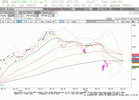 16 Nisan seansı yüksek seviyesi 1747.25 iken Nisan vadeli BIST30 bu seviye üzerinde 1490 ara direnç olma üzere 1515 seviyesine doğru yükselişini sürdürebilir. Küresel hisse senedi piyasalarında pozitif fiyatlamalar ABD haftalık işsizlik maaşı başvurularında düşüş ve bankacılık sektörü bilanço desteği ile tam gaz sürerken bu şekilde giderse S&P500 endeksi yılsonu hedeflerini yaz aylarına girerken yakalamış olacak. Morgan Stanley Gelişen Ülke Piyasaları Endeksi 17 Şubat yüksek seviyeleri gerisinde ancak 24 Mart tarihinden bu yana yükselişte; genel olarak gelişen ülke piyasalarını takip ediyor. Bankacılık sektörü hisse senetlerinde alımlar ile dün vadeli BIST30 endeksi pozitif ayrıştı. Bugün aynı eğilimin devam etme ihtimalini yüksek görürken bir sonraki haftanın menkul kıymet istatistiklerinde yabancı alımları görmek olumlu olacaktır. Kısa vadeli alım satım stratejisi yapan traderlar yerine kurumsal yatırımcı olan fonlar bankacılık sektörünü ilgi gösteriyor ise vadeli BIST30’da yükselişin devamı gelebilir