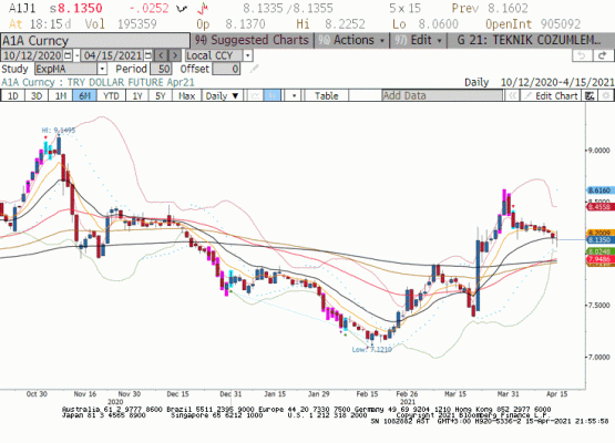 Nisan vadeli Dolar/TL paritesinde 8.1500 altında kapanış ile 8.0250 seviyesine doğru düşüş potansiyeli olduğunu düşünüyoruz. 50-100 ve 200 günlük üssel hareketli ortalamalar 7.9000 etrafında iken bu seviyenin aşağı yönde kırılması ile TL’in değer kazanımı zamana yayılabilri. Ancak geçtiğimzş haftadan bu yana değişen tek şey küresel pozitif hava ve dışarıda Dolar Endeksinde geri çekilme olduğundan şimdilik 7.9000 altında fiyatlama kalıcı olmayabilir. Merkez Bankası politika faizini beklendiği gibi yüzde 19 seviyesinde bıraktı. İleriye dönük ekonomik görünümde banka yüksek faiz ortamının krediler kanalı ile iktisadi faaliyeti yavaşlatacağını düşünüyor. Bu senaryoda bankanın faiz artırımına gerek duymadığı anlaşılıyor. Yaz aylarına girerken covid vaka sayısı ve aşılama süreci le turizm gelirleri Dolar/TL paritesi için bu denklemde önemli bir yer teşkil ediyor.