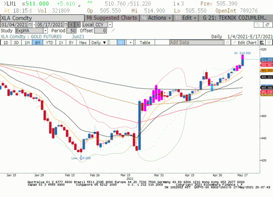 Haftanın ilk işlem gününde zayıf dolar ve alternatif piyasalara gelen satışlardan aldığı destek ile 1852 doları rahatlıkla geçen altın bu seviye üzerinde kaldığı sürece 1885 dolara doğru yükselişini sürdürebilir. Geçtiğimi haftalarda yüksek dalga boyları ile 2020 senesine kıyasla göze çarpmayan yükselişler bir kesimi altına temkinli bakmaya sevk ediyor. Öte yanda COMEX’te fon alımlarına baktığımızda 11 Mayıs ile biten haftada fon alımları 33256 kontrat olarak gerçekleşmiş. Dört haftada toplamda 23597 kontrat alım yapılan piyasa 11 haftanın yüksek seviyesinde net uzun pozisyon taşıyor. Anlaşılan altında yükseliş potansiyeline ABD cephesinden inanan kurumsal yatırımcı sayısı artıyor. Kısa vadede hızlı yükseliş ile uzun pozisyon artışı aşırı alım bölgesinde görünse de bu piyasanın daha fazla uzun pozisyonu taşıyacak kapasitesi var. 17 Mayıs ETF altın fonlarına da ilgi olduğunu sene başından bu yana %6.4 lük düşüşe rağmen 14 Mayıs senasında 230.6 milyon dolarlık altın ETF alımı gerçekleştiğini görüyoruz. Özellikle kripto para piyasasındaki hareket ve satışların devamı altın ETF’lerine ilginin artmasını sağlayabilir.