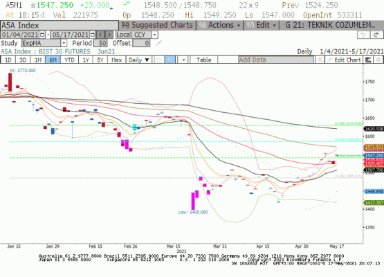 Küresel hisse senedi piyasalarında Amerika ve Avrupa’da ılımlı denebilecek satışlar görülürken gelişen ülke piyasaları içinde Türkiye spot piyasada %1.63’lük prim ile kapalı olduğumuz dönemdeki arayı kapatmaya çalıştı. Polonya hariç diğer gelişen ülke endekslerinin yatay seyrettiğini gözledik. ABD’den başlayıp Dünya genelini etkileme potansiyeline sahip enflasyonu şimdiden fiyatlamak istemeyen piyasalar gelişen ülke ekonomilerini rahatlatmış görünüyor. ABD’DE işlem gören gelişen ülke piyasaları EFT’lerine 28. Haftada girişlerin sürdüğü anlaşılıyor. Geçtiğimiz hafta hisse senedi EFT’lerine 490 milyon dolar giriş gerçekleşmiş. Yine de her enflasyon verisi ve Merkez Bankaları toplantısında gündeme gelecek olan yüksek enflasyon endişesi önümüzdeki dönemde gelişen ülke piyasaları üzerinde Demokles’in kılıcı şeklinde duruyor. Bugün vadeli endeks içinde ağırlığı yüksek olan bankacılık sektörü desteği önemli iken 1540 üzerinde kaldığı sürece yükseliş potansiyeli korunuyor.