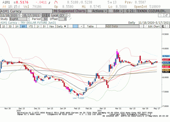 Geçtiğimiz hafta ABD’de yüksek enflasyon ardından yaşanan satış baskısını geride bırakan piyasalar yeni haftaya kararsız bir başlangıç yaptı. Kısaca risk alma eğilimi devam ederken yeni rekorlar için zorlanan piyasa görüntüsü alıyoruz. İçeride Nisan ayı bütçe açığı 16.9 milyar dolar ile piyasa beklentisinin altında gerçekleşti. Bugün yapılacak kabine toplantısına gelince 17 Mayıs ile başlayan kademeli normalleşmeye ilişkin detaylar ile esnaf ve küçük işletmeler için hazırlanan 5 milyar TL’lik kredi paketine ilişkin açıklamalar öne çıkıyor. Kamu ve özel bankaların aracılık edeceği paketten yıllık satışları 10 milyon TL olan firmalar faydalanabilecek. Dolar/TL paritesindeki haraketliliğe gelince Banka hazinecilerden gelen açıklamaya göre 2.5 günlük bayram tatili ardından hafta başında perakende ve şirket hesaplarından gelen satışlar kurun gerilemesini sağladı. Güne 8.5580 seviyesinde başlayan Haziran vadeli Dolar/TL paritesinde kapanış 8.5176 seviyesinde gerçekleşti. Teknik olarak 8.5000 altında kapanışlar ile vadeli Dolar/TL paritesinin 8.3700 desteğine doğru geri çekilebileceğini düşünüyoruz.