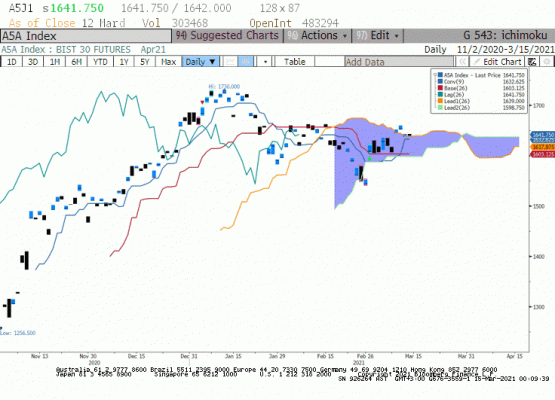 Geçtiğimiz gün kontrat günü yüzde 0,69 düşüşle 1618 puandan tamamladı. Gün içinde küresel piyasalardaki pozitif momentumdan etkilenen kontratta akşam saatlerinde yaşanan satışlar ön plana çıkarken, seans kapandıktan sonra yaşanan siyasi gelişmeler nedeni ile bugün kontratta TCMB'nin kararının yanı sıra siyasi gelişmeleri de yakından takip ediyor olacağız. Diğer yansan geçtiğimiz gün FED Başkanı Powell'ın güvercin söylemleri nedeni ile küresel piyasalardaki fiyatlamaların kontrata pozitif etki edebileceğini düşünüyoruz.