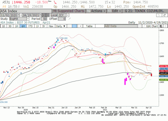 ABD’de işlem gören gelişen ülke piyasaları ETF borsa yatırım fonlarına son 24 haftada girişlerin devam ettiğini görüyoruz. Geçtiğimiz hafta hisse senedi EFT’lerine 336.5 mio dolar bono EFT’lerine 412.8 mio dolar giriş gerçekleşti. Morgan Stanley Gelişen Ülke Piyasaları Endeksi %0.7 artış ile 16 Mart tarihinden bu yana en yüksek seviyesinde kapanış yaptı. Bu tabloda BIST100 ve vadeli BIST30 endeksinin de sürüye katılması ve yükseliş denemelerini sürdürmesi beklenirken tersi hareket gözlemliyoruz. Güne 1466 açılışı ile başlayan vadeli BIST30 sonrasında yaşanan satışlar ile 4 günlük üssel hareketi ortalaması olan 1455 altında zayıf bir kapanış yaptı. Bugün endeksin 1470 üzerine atamadığı senaryoda bollinger alt bant 1420’ye doğru geri çekilme sürebilir.