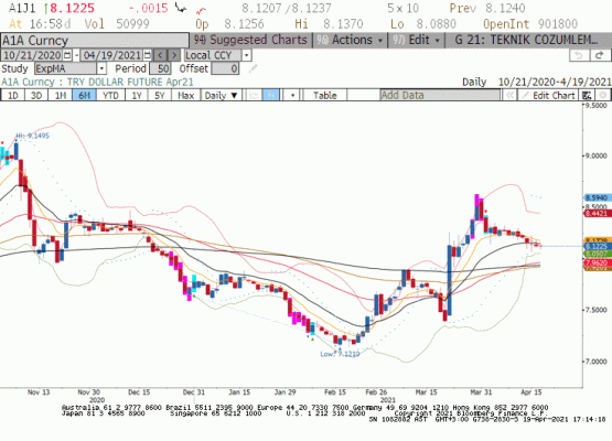 Nisan vadeli Dolar/TL paritesinde bollinger alt bant 8.0500’in aşağı yönde kırılması durumunda 50-100 ve 200 günlük hareketli ortalamaların toplandığı 7.9000-7.9500 aralığına doğru geri çekilme sürebilir. Dışarıda Dolar Endeksi 91.10 endeks seviyesine yaklaşırken endeksinde bu hafta 90.30-90.50 aralığına doğru geri çekilme eğilimi sürebilir. Gelişen ülke para birimleri son 5 günde ABD Doları karşısında değer kazanırken Brezilya Real’i ve Güney Afrika Rantı yükselişte başı çekiyor. Küresel hisse senedi piyasaları haftaya hafif geri çekilme ile kararsız başlamış olsa da genel olarak beklentiler olumlu ve yeni zirveler görülebilir. Bu ortamda TCMB toplantısı da geride kaldığına göre vadeli Dolar/TL paritesinin 8.0500 TL altına yerleşmesini beklerdik. Bu geri çekilmenin gecikmesi Rusya ile ABD arasında yaptırımlar ile gerilen ilişkilere ve bu denklemde Türkiye’nin artan jeopolitik risklerden olumsuz etkileneceği yönündeki endişelere bağlanabilir.