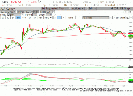 Ağustos Vadeli Kontrat geçtiğimiz işlem gününü dalgalı bir seyir izleyen Dolar/TL paritesi günü 0.62% artış ile 8.57 seviyesinden tamamladı. Güniçi en yüksek seviye 8.59 en düşük seviye ise 8.54 seviyesi olarak gerçekleşti.Genel yukarı trend devam ederken 8.50 seviyesine kadar yaşanan geri çekilme sonrası trendin alt bandından tepki alımları yaşandı ve tekrardan 8.55 seviyesinin üzerine gelinmiş oldu.
