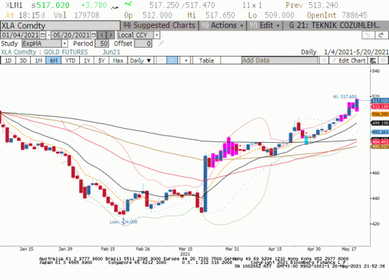 20 Mayıs tarihinde vadeli gram altın hem Dolar/TL paritesinden hem de ons altından aldığı destek ile yükselişini sürdürdü. Dolar/TL paritesinde teknik kırılma ile paritenin kendine yeni bir bant aralığı belirleyeceğini düşünüyoruz. Ons altın ise Dolar Endeksi ve tapering öngörülerini fiyatlarken yeni yüksek seviyeler için zorlanabilir. Kısaca yükselişin devamı ya da kısa vadeli düzeltme arasında kalan Haziran vadeli gram altın son 12 seansın 11’ini yükseliş ile kapattıktan sonra yeni yüksek seviyeler için zorlanabilir.