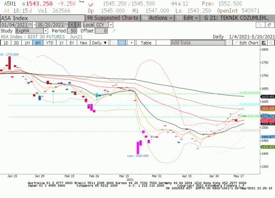 Küresel hisse senedi piyasasında yaşanan satışlara paralel vadeli BIST30 endeksi 9.250 puanlık düşüş ile 1543.250 seviyesinde kapanış yaptı. Endekste ağırlığı yüksek olan Ereğli demir çelik hisse senetleri günü %4.0 düşüş ile kapatırken Garanti ve Akbank gibi bankacılık sektöründe yaşanan alımlar endekse destek verdi. ABD’de canlı seans ile teknoloji hisse senetlerine gelen alımlar hafta ortasında yaşanan satış baskısından iyimserliğe dönen ibre bugün de korunabilir ise Haziran vadeli BIST30 endeksinde bugün alıcılı bir seans görebiliriz. Özellikle bankacılık sektörü özelindeki yatırımcı ilgisi önümüzdeki haftalarda endeksin performansı üzerinde etkili olmayı sürdürecek. Her durumda teknik olarak 1540 üzerinde haftalık kapanış ile yükseliş denemeleri sürebilir.