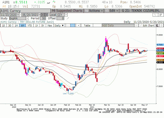 Haziran vadeli Dolar/TL paritesi 20 Mayıs seansında dar bir aralıkta işlem gördükten sonra 8.5511 seviyesinde kapanış yaptı. FED önümüzdeki toplantılarda varlık alımlarını azaltmayı tartışabilir gündemi ile Döviz piyasasında Dolar Endeksi 90.00 seviyesi üzerinde işlem görürken dün açıklanan ABD ekonomik verilerinin beklenti altında kalması ile 90.00 seviyesi altına geriledi. FED’in istihdam başta olmak üzere ekonomik veriler istenilen seviyeye ulaşıncaya dek ekonomiyi destekleme sözü artık daha sık sorgulanmaya başlayacak. Bu koşullar gelişen ülke para birimleri için negatif olsa da gelişmiş ülke merkez bankalarının bünyelerinde artan enflasyon eğilimine rağmen tapering (varlık alımlarını azaltmak) için aceleci olmayacağını düşünüyoruz. Bu durumda dışarıdaki gelişmeler tehdit olsa da içeride ekonomik veriler ve enflasyonist eğilim ile Dolar/TL yön aramaya çalışacaktır. Yaz aylarında enflasyonist baskının azalması TL pozitif olabilir ancak henüz bu fiyatlama için döviz piyasasını harekete geçirecek veriler görmüyoruz. Teknik olarak vadeli Dolar/TL paritesinde daralan bollinger bant bir yöne kırılmanın yakın olduğu imajı veriyor.