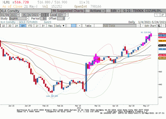 Gram altın fiyatları geçtiğimiz hafta da yükseliş eğilimini korudu ve 516.720 seviyesinde kapanış yaptı. Piyasaların enflasyon konusuna hassasiyeti ve Dolar Endeksi’nin yönü bu hafta da altın fiyatlaması üzerinde etkili olacak. Öte yanda uzun vadeli tahvil faiz oranlarındaki yükseliş eğiliminin yerini yatay harekete bırakmış olmasını bu dönemde ons altın için avantaj olarak görüyoruz. Alternatif piyasalarda kripto varlıklarda gözlenen satış baskısı ve büyüyen dalga boyları ile bu tarafta nakde dönme isteği de altın ayarmış görünüyor. Sene başından bu yana bakıldığında altın EFT’leri %6.1 düşüş ile 100.5 milyon ons seviyesine geriledi. Ancak son 8 işlem gününde kademeli olarak alımların olduğu ve ETF yatırımcısının altına geri döndüğü anlaşılıyor. 06 Mayıs tarihinde 99.431 milyon ons olan altın EFT’leri 21 Mayıs tarihinde 100.783 milyon ons seviyesine yükseldi. COMEX’te fon alımlarına gelince son dört haftada 40389 kontrat alım ile 252270 kontrata yükseldi. Son 12 haftanın yüksek seviyesinde olan net uzun pozisyonu kısa vadede yüksek seviyede görünse de geçtiğimiz sene rekor pozisyon seviyelerine bakınca gidecek yolu var.