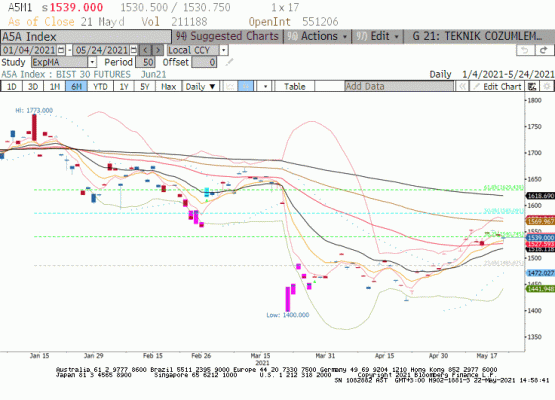 Geçtiğimiz hafta 1530-1553 Aralığında işlem gören Haziran vade BIST30 endeksinde kapanış 1539 seviyesinde gerçekleşti. Vadeli endeks bu hafta 1540 üzerinde kapanışlar ile güç toplayarak 1554 ara direnç olmak üzere 1570 endeks seviyesine doğru yükselişini sürdürebilir. Öte yanda bilanço sezonu da geride kaldığına göre dışarıda enflasyon endişesine paralel küresel hisse senedi piyasalarına hassasiyetin arttığı bir döneme girmiş bulunuyoruz. Enflasyon geçici mi kalıcı mı diye konuşulurken üyeler 2022 yılında ekonomide kullanım alanı yüksek olan hammadde fiyat artışlarının gerileyebileceğini düşünüyor. Eğer beklendiği gibi olmaz ve ise FED ve diğer gelişmiş ülke Merkez Bankaları sözlü, açık piyasa işlemleri ile ya da politika faizi ile enflasyonist eğilimi kırmak isteyecektir. Bu senaryo gelişen ülke piyasaları için negatif olmakla birlikte kısa dönemde saldırgan fiyatlanmaya gerek görülmeyebilir Henüz erken ve geçtiğimiz hafta emtia piyasasında fiyatlarda yaşanan aşağı yönlü düzeltme hafif de olsa rahatlama sağladı. Yaz aylarında Dünya genelinde enflasyonun seyrini piyasalar sıkı takibe alarak arada yukarı gitmekte zorlandığı dönemlerde geri çekilme için bahane edecektir.