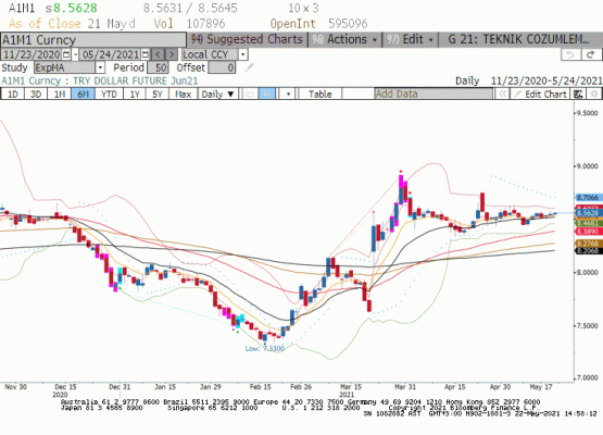 Haziran vadeli Dolar/TL paritesi 8.5000-8.5850 olmak üzere dar aralıkta işlem gördükten sonra haftayı 8.5628 seviyesinde kapattı. Önceki raporlarımıza belirttiğimiz üzere günlük grafikte daralan bollinger bant ile kırılma zamanının yaklaştığını düşünüyoruz. Bu hafta karar haftası olabilir. Küresel döviz piyasası enflasyon geçici mi kalıcı mı anlamaya çalışırken Dolar Endeksine yön vermekte zorlanıyor. İçeride Haziran-Eylül döneminde hızlanması beklenen aşılama ve normalleşme ekonomik anlamda olumlu. Öte yanda emtia piyasası geçtiğimiz hafta yaşanan geri çekilmeye karşın muhtemelen bir seviyede dengelenecek ve tekrar arz/talep dengesine bakarak yükselişini sürdürecek. Bu senaryoda dışarıda yükselen emtia fiyatları içeride geri çekilmekte zorlanan enflasyon ile TL’nin değer kazanımının sınırlı kaldığını görüyoruz. Haziran vade Dolar/TL paritesi 8.5000 altına yerleşmeden yeni düşük seviyeler çağırmakta zorlanıyoruz. Ancak bu hafta 8.5000 altına yerleşilir ise önümüzdeki günlerde 8.4000 ara destek olmak üzere 8.2700 seviyesine doğru geri çekilme görülebilir.