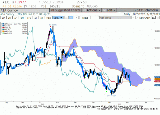 Yakın Vadeli Dolar TL geçtiğimiz günü 7,9734 seviyesinden kapattı. Gün içinde Türkiye'nin risk primi 456 baz puandan işlem görürken, gösterge tahvil faizi yüzde 20,2 seviyesinde işlem gördü. Diğer yandan Türkiye Cumhuriyet Merkez Bankası (TCMB) başkanlığında yaşanan görev değişimini takiben yüzde 1.300 seviyesini aştıktan sonra hafta ortasında gerileme kaydeden gecelik TL swap faizlerinde yön geçtiğimiz gün yeniden yukarı döndü.