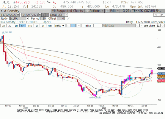 Ons altın fiyatları seans içinde 1768.89 seviyesini gördü ancak kapanışı 1780 civarında yaptı. FED toplantısı ve sonrasında tahvil piyasası başta olmak üzere piyasa etkisini görmeden 1800 doların test edilmesi güç. Mart ayını son işlem gününde başlayan ve altın fiyatlarını 22 Nisan tarihinde 1797 dolara taşıyan yükselişin 1800 dolar üzeri fiyatlamalar ile sürmesi muhtemel görünüyor. Ancak son dönem yaşanan yükselişte fonların alımlarına rağmen Borsa Yatırım Fonlar ETF ile yapılan yatırım miktarında artış olmayışı moral bozuyor. Geçtiğimiz seneye benzer kalıcı yükselişler ve yeni zirveler için borsa yatırım fonlarına ilgiyi görmek gerekiyor.