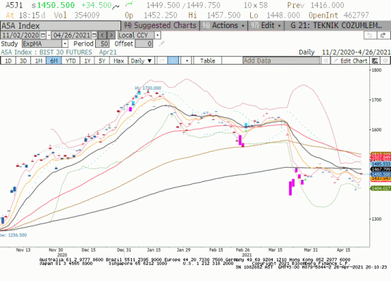 22 Nisan seansında 1416’da kapanış yapan Vadeli BIST30 endeksi 26 Nisan tarihinde 1448-1457 aralığında işlem gördükten sonra günü 1450 seviyesinde kapattı. Nisan vadeli endeks 1455 üzerinde kapanışlar ile güç toplayarak yükseliş eğilimini sürdürebilir. Spot piyasada BIST100 içerisinde sektör ve hisse senetleri performansına bakıldığında taşıyıcı konumda olan sektör ve hisse senetlerinde gözlenen alımlar pozitifti. Bilanço sezonundayız ve yeni haftaya başlarken açıklanan bilançoların beklentilerin üzerinde olması moral verdi. Güne başlarken 17 Mayıs tarihine kadar devam edecek olan tam kapalılık hali başlangıçta moral bozsa da özellikle yaklaşan turizm sezonu düşünülerek olması gereken olarak görülüyor. Kısaca Mayıs ayında ekonomik aktivite ve servis sektörü tarafında zayıflama kaçınılmaz olacak. Yatırımcı bir taraftan vaka sayılarındaki değişim bir taraftan ilk çeyrek bilançoları ile BIST100 endeksine bu dönemde daha pozitif bakabilir. Bu ihtimalin vadeli BIST30 endeksini 200 günlük üssel hareketli ortalaması olan 1468 ve üzerine taşıyabileceğini düşünüyoruz.