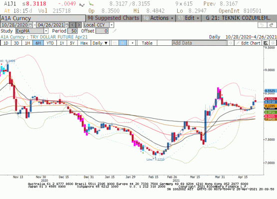 Nisan vadeli Dolar/TL paritesi 8.4842 yüksek seviyesi ardından 8.3118 seviyesinde kapanış yaptı. 20 Nisan tarihinden başlayarak gözlenen kurda volatilite artışı 26 Nisan seansında yerini makul seviyelere bıraktı. Hafta sonu Joe Biden’ın Ermeni soykırımı ifadesini kullandığı konuşmasının TL ve TL cinsi varlıklardaki fiyatlaması öncesinde olduğundan haftanın ilk işlem günündeki etkinin limitli kaldığı söylenebilir. Kısa vadede Nisan vadeli Dolar/TL paritesinde 8.2000 altında kapanışlar ile TL’nin değer kazanımı hız kazanabilir. Son haftalarda gelişen ülke para birimlerinin değer kazanımı ve küresel risk alma iştahı içeride TL’yi rahatsız eden negatif haber akışına rağmen koruma görevi üstleniyor. Yukarıda 8.4000 üzerinde TL negatif fiyatlama ağırlık kazanabilir. Kısaca 8.2000-8.4000 Aralığının kırılma yönünü önemsiyoruz.