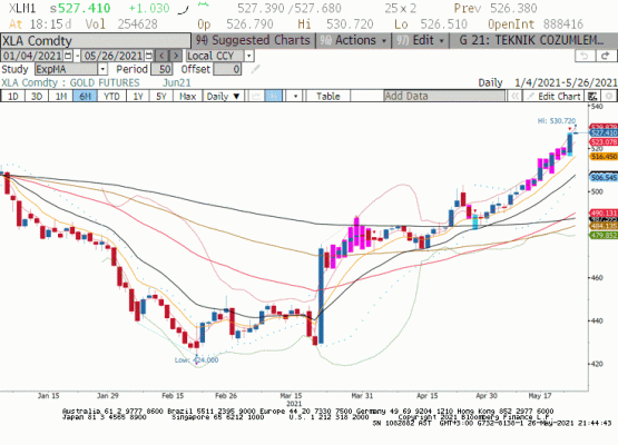 Ons altın 1900 üzerimi altı mı yeni fiyatlama aralığını belirlemeye çalışırken TL’nin 8.4000 üzerinde kalması gram altın için koruma görevi gördü. Haziran vade gram altında günün yüksek seviyesi 530.720 iken kapanış 527.410 seviyesinde gerçekleşti. Gram altında bollinger bandı zorlayan yükseliş haftanın ikinci yarısında yerini ılımlı bir düzeltmeye bırakabilir.