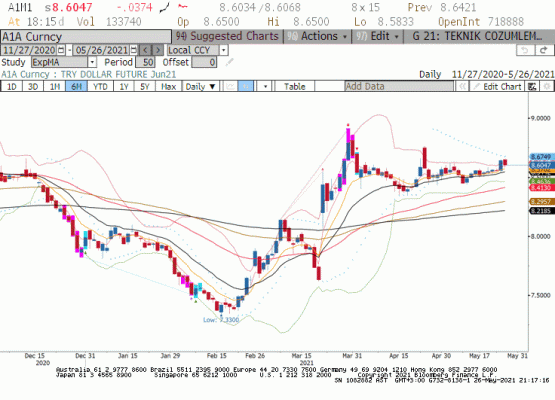 Haziran vade Dolar/TL paritesinde günün yüksek seviyesi 8.6500 iken kapanış 8.6047 seviyesinde gerçekleşti. Vadeli Dolar/TL paritesi 8.5400 üzerinde kaldığı sürece yükseliş eğilimini koruyabilir. Kısa vadede 8.5400-8.6750 bandının kırılma yönü önemli görülüyor. Dışarıda spot piyasada Dolar Endeksi’nin 89.50 altını ret ederek 90.00 seviyesine yükselişi gelişen ülke para birimleri için negatif iken 5 yıllık Türkiye CDS priminin 403 ile fazla değişimi göstermiyor oluşu pozitif. Öte yanda bir önceki gün yaşanan yükselişin ardından vadeli kurun haber akışına hassasiyetinin arttığını ve negatif haber akışını fiyatlamakta daha istekli olduğu anlaşılıyor.
