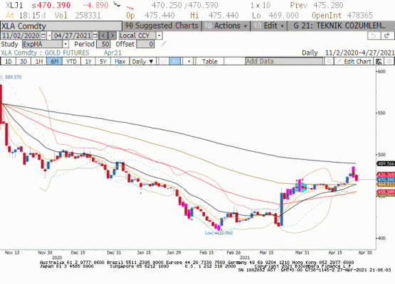 Ons altın fiyatları 27 Nisan seansında dar bir bant içinde hareket ardından 9 günlük üssel hareketli ortalama 1774 üzerinde kapanış yaptı. Bugün yapılacak FED toplantısı sonrasında Dolar ve cinsi varlıkların hareketini beklerken altın destek seviyeleri üzerinde kalmaya çalışıyor. Bugün 1770-1785 Aralığının kırılma yönünü önemsiyoruz. FED ve Powell konuşması sonrası artması muhtemel volatilite ons altın fiyatlarının 1785 üzerine taşır ve bu seviye üzerinde kapanış gerçekleşir ise geçtiğimiz hafta yüksek seviyesi 1798 kabaca 1800 denemesi gelebilir. Son haftalarda fon alımlarına rağmen borsa yatırım fonları aracılığı ile yatırımcı talebinin eksik olduğundan bahsediyoruz. Bu durum henüz değişmedi dün limitli bir giriş olmakla beraber altın fonlarına ilgi zayıf ve toplam altın fon büyüklüğü Mayıs 2020 seviyesine gerilemiş durumda. Kısaca 1800 üzeri kalıcı bir yükseliş hareketi için Altın EFT’lerini takip etmeyi sürdürüyoruz.