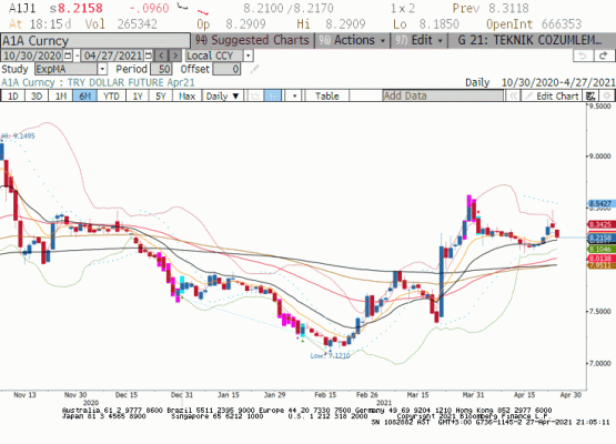 Son beş işlem gününde ABD Doları karşısında gelişen ülke para birimlerinin performansına bakıldığında Rus Rublesi ve Brezilya Real’i ilk iki sırayı paylaşıyor. TL’nin ise ABD Doları karşısında son beş işlem gününde %1.28 değer kaybettiği görülüyor. Vade sonu yaklaştıkça spot ile vadeli Dolar/TL arasındaki fark kapanırken 8.2000 altında kapanışlar ile vadeli kur 8.1000 ara destek olmak üzere 8.0100 desteğine doğru geri çekilebilir. Bugün yapılacak FED toplantısı ve sonrasındaki fiyatlamalarda Dolar Endeksi ve uzun vadeli tahvil getirilerinin vereceği tepki önemli iken küresel risk alma iştahı ve Euro/dolar paritesinde yükseliş TL’nin değer kazanımını destekleyebilir. Dışarıda Dolar Endeksinin yükseliş eğilimine girdiği ve tahvil getirilerinin enflasyon bekleyişi ile yükseldiği senaryo ise TL negatif görülüyor.