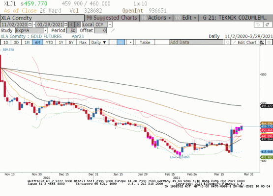 Kıymetli metallerde Ağustos 2020 tarihinden bu yana gözlenen satış baskısı ABD tahvil piyasasındaki fiyatlama ile Mart ayı başında altın fiyatlarını 1680 dolar/ons seviyesine taşıdı. ABD 10 ve 30 yıllık tahvil faiz oranlarında yükseliş geçtiğimiz hafta başında yerini alımlara bıraktı. Ancak alımlar ile gelinen seviyeler bu hareketin tepki niteliğinde olduğunu gösteriyor. 1.9 trilyon dolarlık teşvik paketi ardından alt yapı yatırımları için 3 trilyon dolarlık yeni bir paket hazırlığı içerisinde olan Biden yönetimi bir taraftan da vergi politikasında değişklik yapmayı planlıyor. Gelir artırıcı önlemler beklenirken bu durumun ABD Dolarını 93.50 endeks seviyesi üzerine taşıyabileceği konusunda şüpheliyiz. Bu çerçevede geçtiğimiz hafta gram altın TL'in değer kaybından aldığı destek ile yükseldi. Yeni haftada ons altn fiyatlaması bir yana gram altının yönü büyük ölçüde TL'in kaderine bağlı görülüyor. Dolar/TL paritesinde Kasım 2020 zirvesi 7.5800'in görülmesi bu hafta altın fiyatlarının 470-480 bandına taşıyabilir.