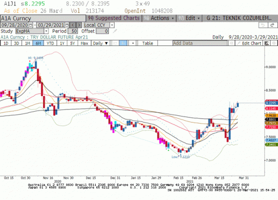 22 Mart seansında en yüksek 8.2602 gören Nisan vadeli Dolar/TL kontratı haftayı 8.2295 seviyesinde kapattı. Vadeli Dolar/TL paritesi 8.1000 seviyesi üzerinde kaldığı sürece yükseliş eğilimini korurken 8.4700 üzerinde alımların hızlanması beklenebilir. Haftanın ilk işlem gününde yapılacak kabine toplantısı öncesinde Bakanlar kurulunda değişiklik ihtimali var iken Ankara'dan gelecek haber akışı döviz piyasasının takibinde olacak. İlk işlem gününde açıklanacak önemli bir veri yok iken 31 Mart Şubat ayı dış ticaret dengesi ve Mart ayı ekonomik güven endeksi yanında Perşembe günü açıklanacak net yabancı portföy akımları ekonomik takvimi oluşturuyor.