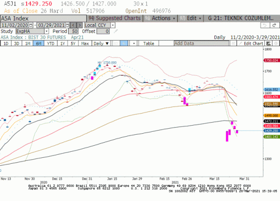 Nisan vadeli BIST30 endeksi kaldıraç etkisi ile geçtiğimiz haftanın ilk işlem gününde yaşanan satışlardan nasibini aldı. Haftanın düşük seviyesi 1381 iken kapanış 1429 seviyesinde gerçekleşti. Teknik olarak 1472 endeks seviyesi üzerine çıkılmadıkça düşüş eğilimini koruyacağını düşündüğümüz endekste 1400 altında geçtiğimiz haftanın düşük seviyeleri test edilebilir. Hafta boyunca Londra'da TL tarafında yükselen borçlanma maliyetleri ve endekste ağırlığı yüksek hisse senetlerinde yaşanan satış baskısı ile bu hafta yabancı yatırımcının tavrı piyasanın yönünde önemli olacak. Kamu bankalarında görev değişimi ve bankaların uluslarararı piyasada önümüzdeki dönemde artması muhtemel borçlanma maliyetli ile sektör hisse senedi piyasaları için kritik önem taşıyor. Son bir senede sınai sektörü önderliğinde yükselen BIST100 endeksi kısa vadede bankacılık sektörünün desteğini alamayabilir.Sektördeki hisse senetlerine gelen alımların yurt dışı yerleşik yatırımcı tarafından satış fırsat olarak görülme ihtimali bu hafta piyasa genelinde moral bozabilir.