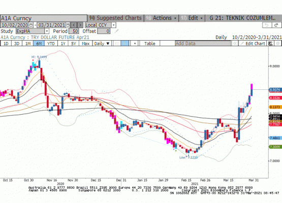 Dolar Endeksi (DXY) sepet para birimleri karşısında güçlenmeye devam ederken endeks 93.30 seviyesine yükseldi. Euro 2020 Kasım ve Aralık aylarındaki kazanımın tamamını geri verdi. USDJPY paritesi 110.30 ile son bir senenin en yüksek seviyesinde gelişen ülke para birimleri de ABD Doları karşısında değer kaybediyor. Ancak TL için durum farklı geçtiğimizi hafatya kadar ABD Doları karşısında güçlenen TL son 10 gün tam tersi bir fiyatlama ile değer kaybetti. Sene başından bu yana ABD Doları karşısında değer kaybı %11 olurken TL geçtiğimiz hafta yaşanan hareket ile en fazla değer kaybeden para birimi oldu. Dün yeni Başkan Şahap Kavcıoğlu'nun TCMB Olagan Genel kurulunda yaptığı açıklamada enflasyon üzerinde faiz politikasına devam mesajı verildi. TCMB mevcut yüksek enflasyon ortamında sıkı para politikasından taviz vermek istemiyor. Erken bir faiz indirimi masada olmadığına göre TL'in bu derece değer kaybına anlam vermek zorlaşıyor. Dün Nisan vade Dolar/TL 8.6160'in görülmesi ardından Başkan'ın açıklamaları ardından geri çekildi. Vadeli D.olar/TL paritesi Kasım ayı zirvesi olan 9.1495 üzerine hareket için bir süre gelişmeleri takip etmek isteyebilir. Kısa vadede 8.3000-8.6000 aralığının kırılma yönü önemli görülüyor.